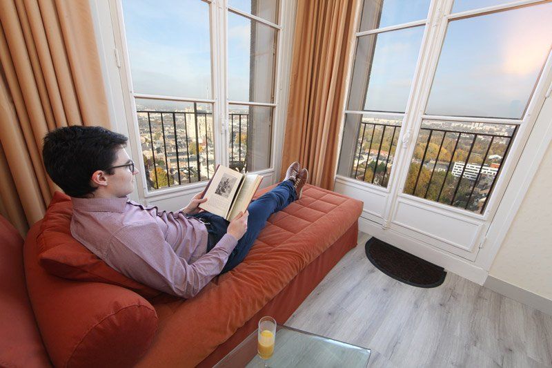 La salle Jules Verne tant aimée ! Allongé sur la méridienne vous contemplerez la Cathédrale, pur joyau gothique, le quartier Saint Pierre et son vaste parc, la Citadelle et…. Vous serez pris au jeu de trouver telle ou telle rue si vous connaissez Amiens, autrement il suffira de faire quelques pas pour aller se balader.
